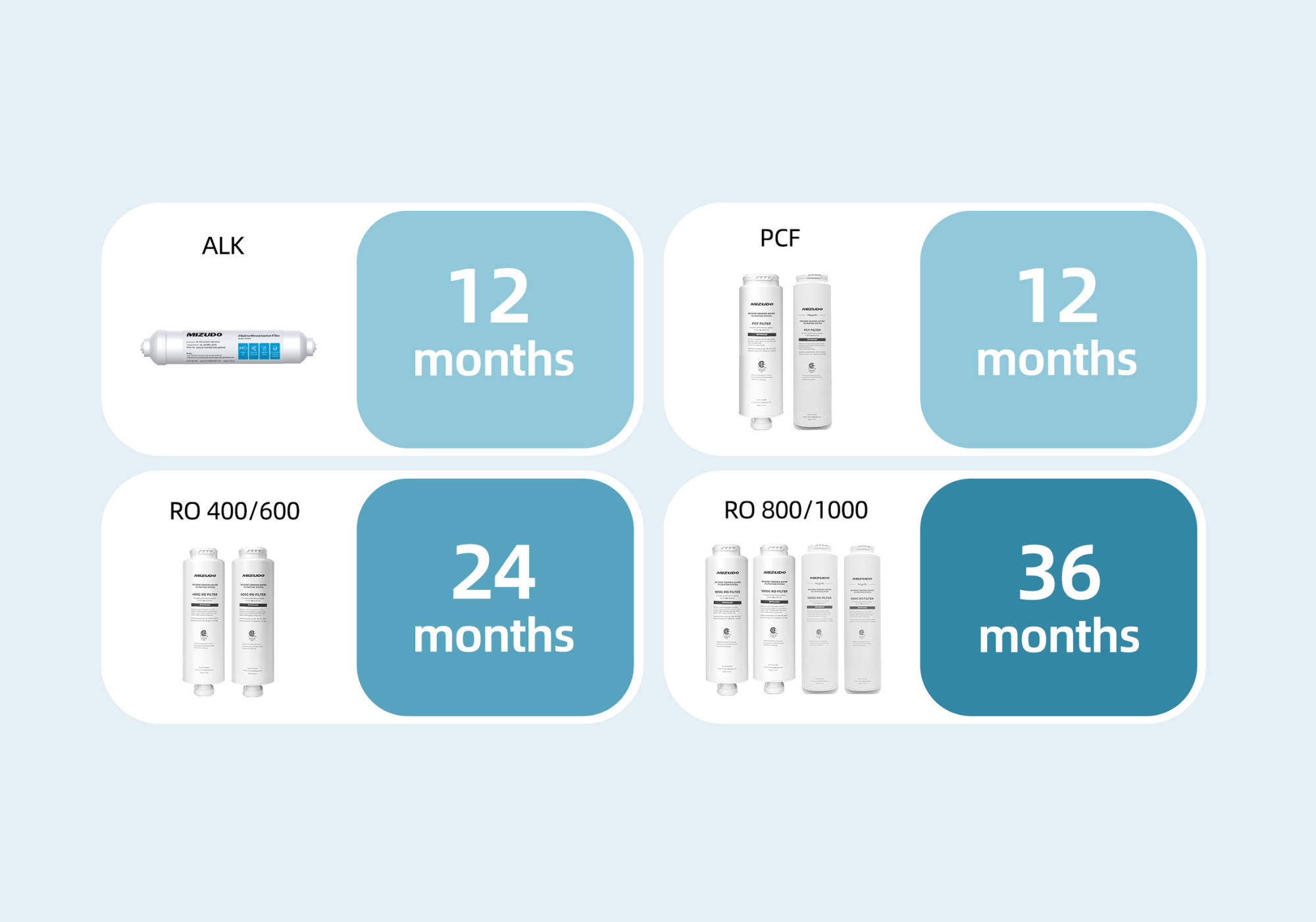 Depending on water quality and usage, MIZUDO filters typically last 12 to 36 months, ensuring long-term water purity.