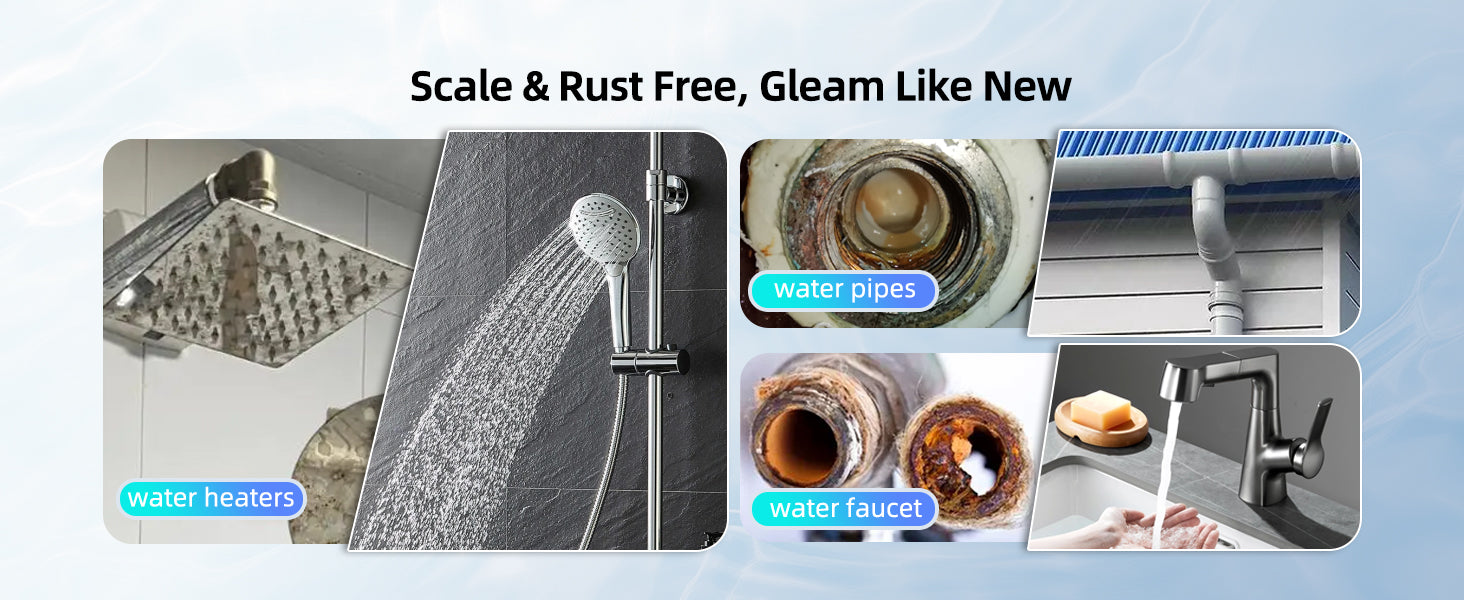 - Inhibits Limescale: The polyphosphates inside help prevent limescale formation by inhibiting the precipitation and binding of calcium and magnesium ions. This innovative technology creates a protective layer within your showers, water heaters, and plumbing systems, keeping them safe from scale buildup and extending their lifespan.