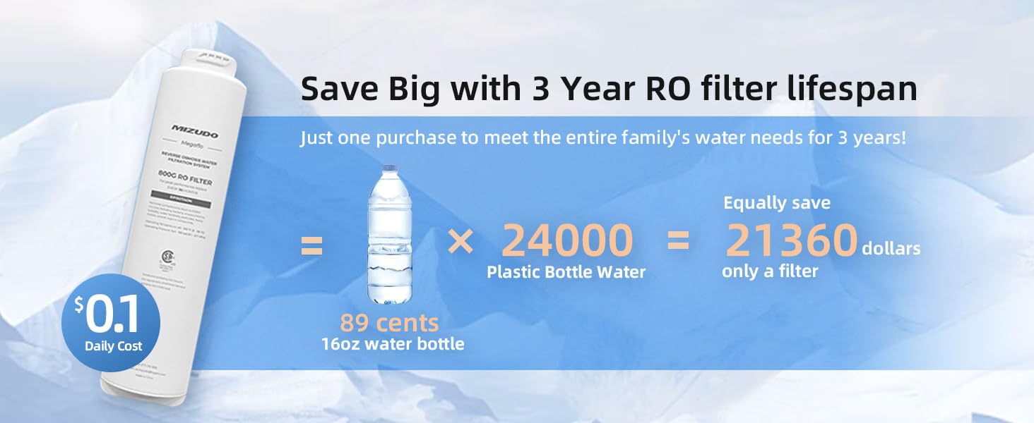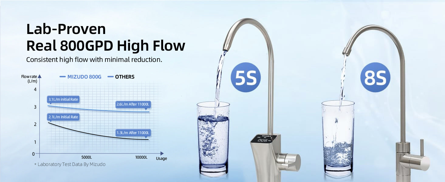 - 800 GPD FAST FLOW: MIZUDO Megaflo RO water filtration system boasts a filtration capacity of up to 800 gallons per day, making it ideal for large families. With a water flow rate of up to 0.6 gallons per minute, it takes only 5 seconds to fill an 8oz glass.