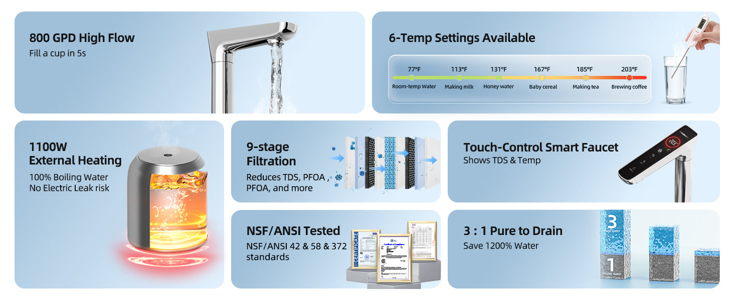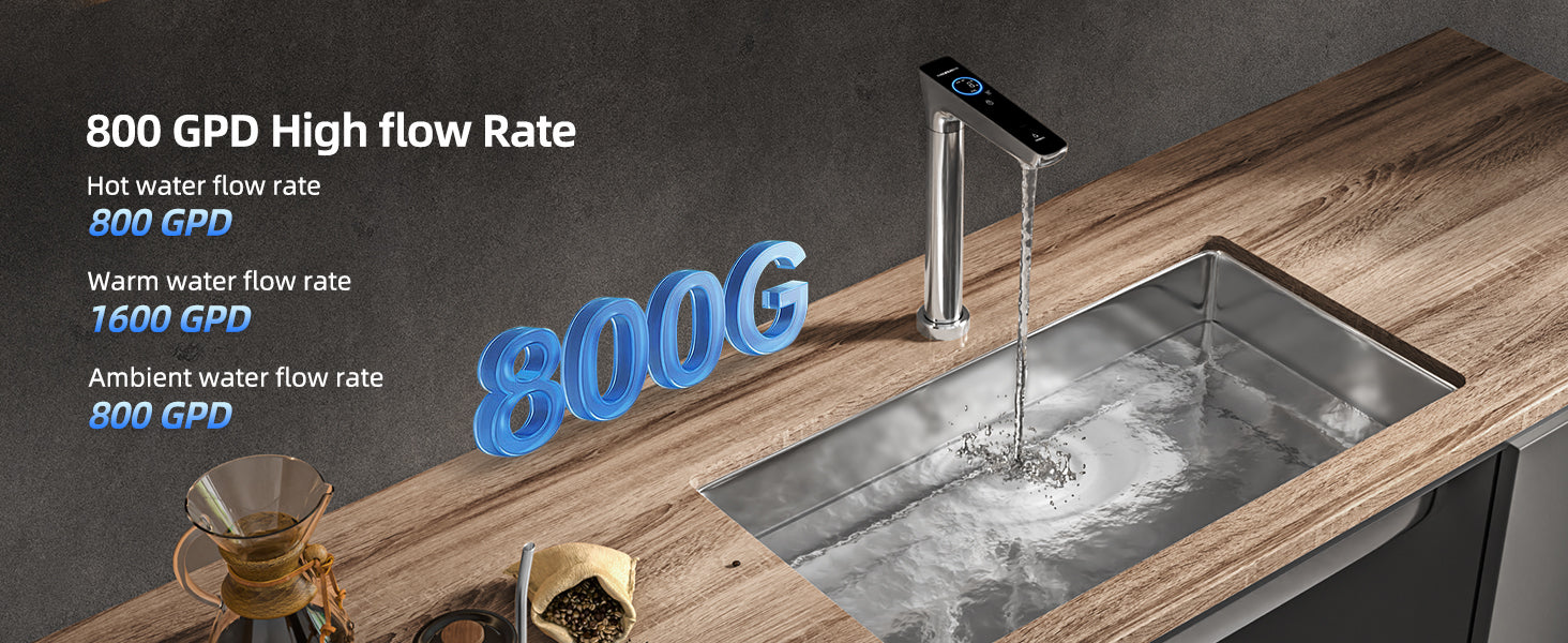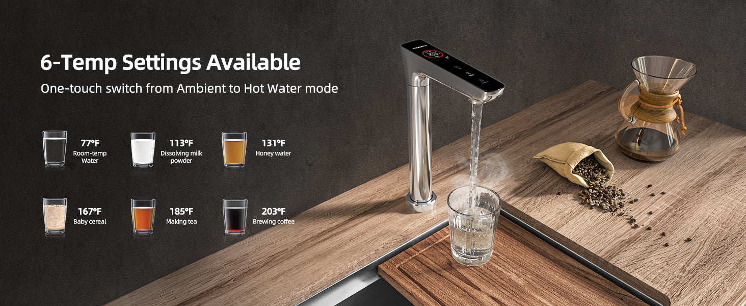 - 【Precise 6-level temp control】Imagine how useful it can be when hot water meets purity! Customize drink temperatures from 104℉ to 203℉, perfect for coffee, tea, oats, baby formulas, soups, or cocoa. With an 800G capacity, this system fills a cup in 5 seconds or a saucepan in just 20 seconds, catering to all intensive water needs during large gatherings or parties.