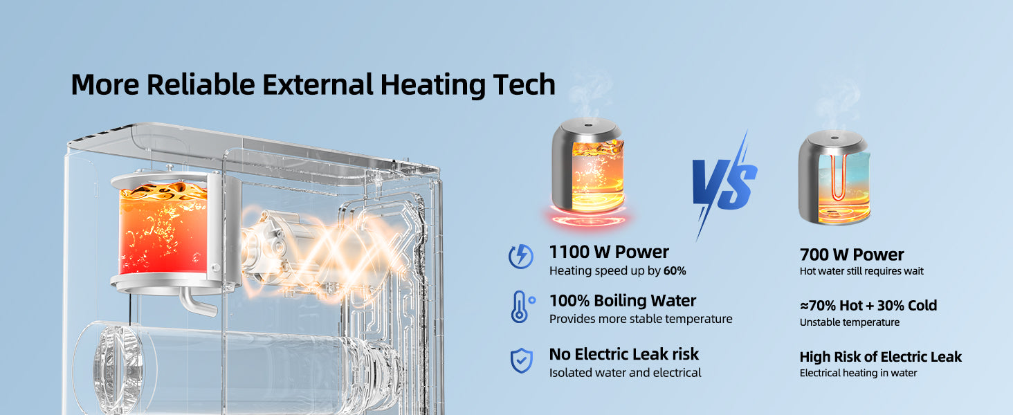 - 【Innovative External Heating Technology】Enjoy faster heating with no worries! Unlike common hot water dispensers,we innovatively adopted external tank heating instead of internal heating from inside the tank, which eliminates electric leaks, enables faster and more uniform heating with a larger heating surface, and avoids temperature fluctuation by separate cold and hot waterways.
