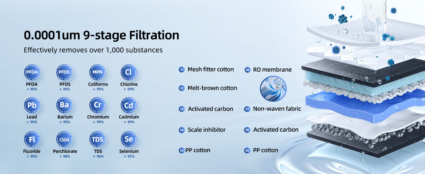 The Mizudo WD800 RO system uses a 9-stage filtration process to remove up to 99.99% of harmful substances, including heavy metals, chlorine, fluoride, cadmium, TDS, PFAS, limescale, rust, and other pollutants as small as 0.0001 microns.