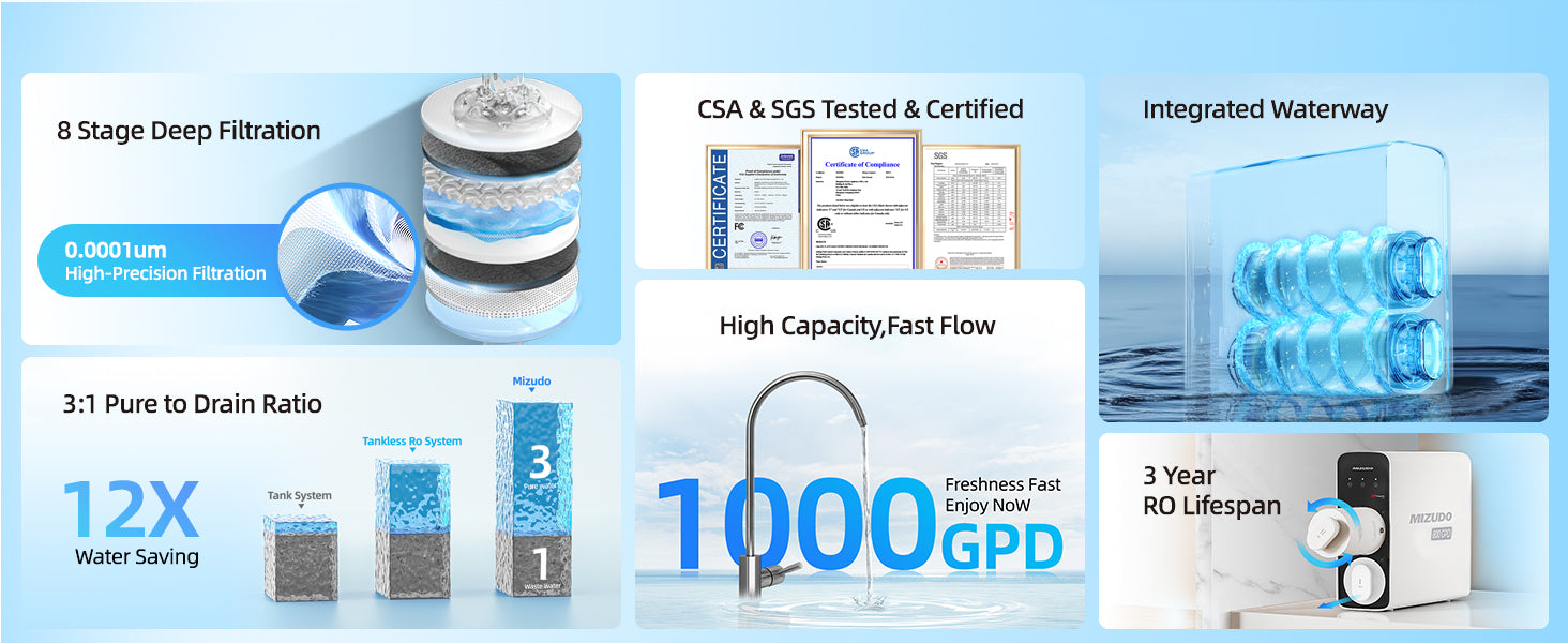 - 【High Flow with 2:1 Pure to Drain】Our under-sink reverse osmosis water filter delivers 1000 GPD of purified water, filling an 8oz glass in just 4 seconds. With an advanced 2:1 drain ratio, it saves up to 1200% more water. Enjoy a 2-year RO filter lifespan and 1-year PCF lifespan, cutting your daily cost to just $0.10!