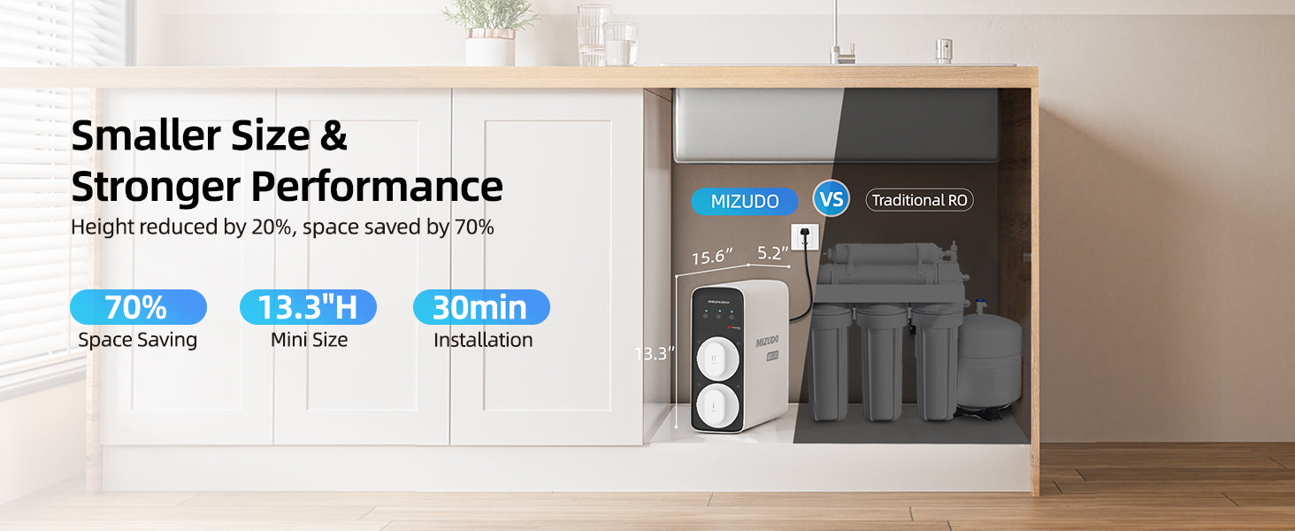 - 【Mini Size, Mighty Power】No undersink space is too small for our ultra-compact RO system! It's 70% smaller than traditional RO and 30% slimmer than other tankless systems, saving 75% of space and fitting seamlessly into 99% of kitchen areas. Whether in apartments, small homes, offices, restaurants, cafes, hotels, or RVs, you can quickly enjoy purified water with a lower budget and reduced footprints.