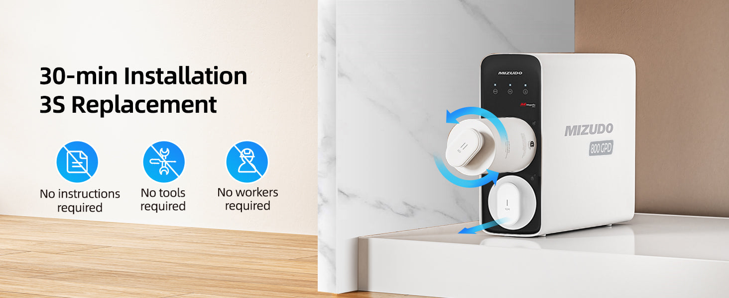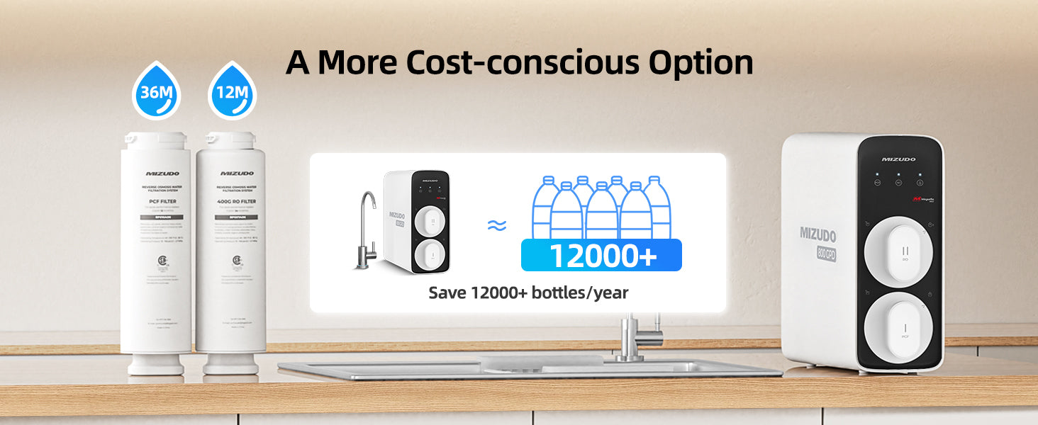There are no installation costs, as the process is straightforward, unike tank R0 systems that reguire complex plumbing. Maintenance involves replacing 1 PCF filter annually and 1 RO filter every 3 years, costing less than $0.10 per day.