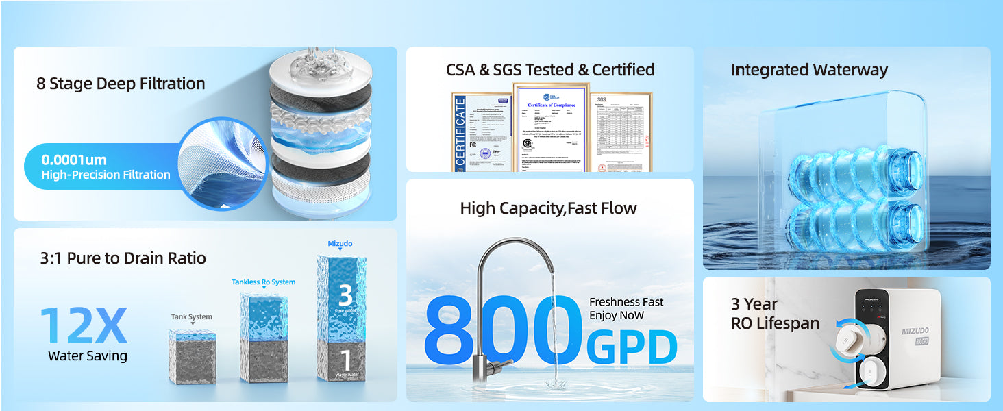 - 【High Flow with 2:1 Pure to Drain】Our under-sink reverse osmosis water filter delivers 800 GPD of purified water, filling an 8oz glass in just 5 seconds. With an advanced 2:1 drain ratio, it saves up to 1200% more water. Enjoy a 2-year RO filter lifespan and 1-year PCF lifespan, cutting your daily cost to just $0.10!