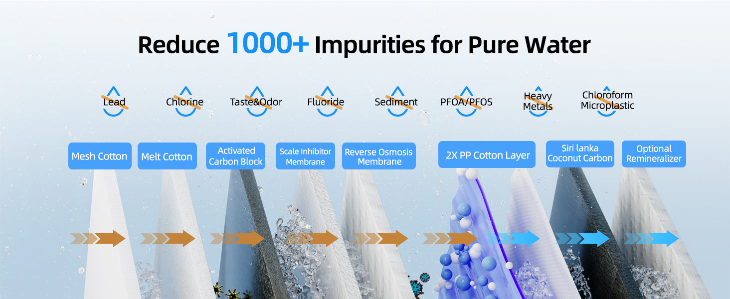- 【Certified Safety & Trusted Purity】Mizudo reverse osmosis system is tested and certified to NSF/ANSI 42, 53, 58, and 372 standards. Made with lead-free and BPA-free materials, it effectively removes over 1,000 contaminants from tap drinking water, including chlorine, fluoride, heavy metals, arsenic, TDS, PFAS/PFOA/PFOS, odors, and more—ensuring you enjoy safe and great-tasting water.
