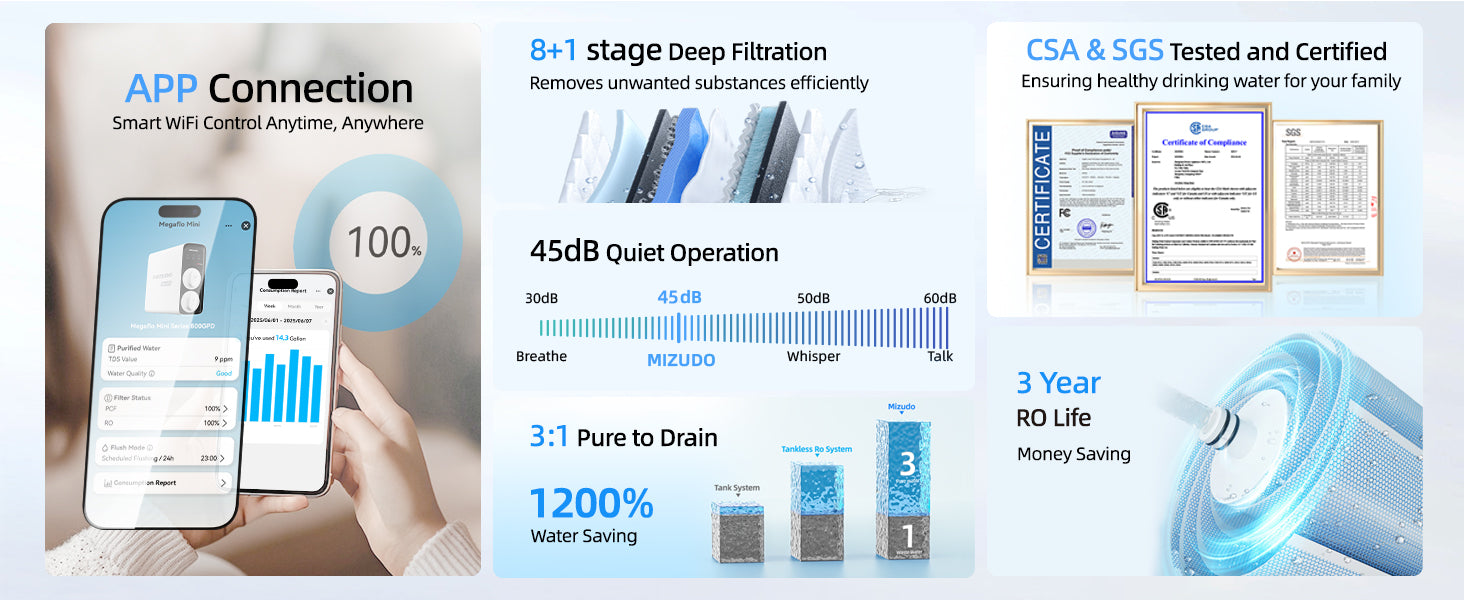 - 【8+1(Alkaline) High-Efficiency Filtration】Our tankless reverse osmosis system features 8 advanced filtration stages, removing over 1,000 contaminants down to 0.0001 microns—including sediment, chlorine, fluoride, heavy metals, odors, TDS, PFAS, PFOA, and PFOS. For added health benefits, you can opt for our mineralization filter, which enriches your water with essential minerals, boost immunity and enhance taste, while also lasting longer than traditional built-in mineral filters.