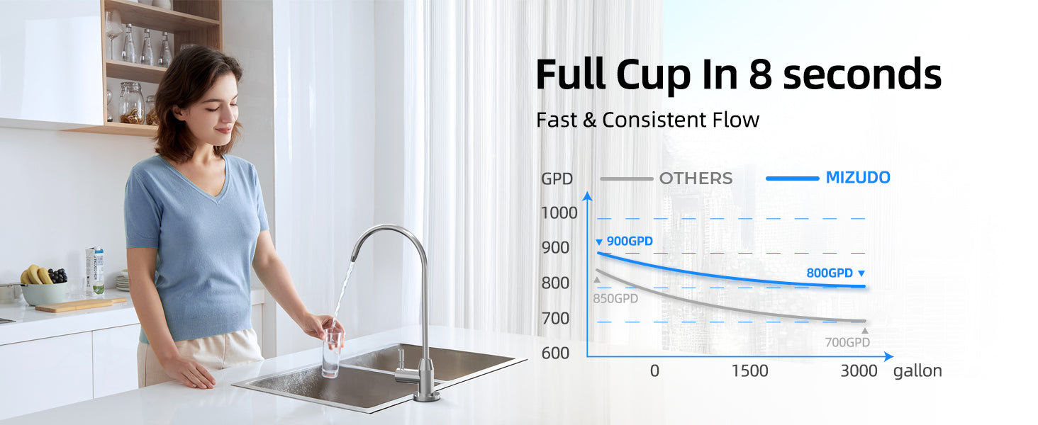 - 【High Capacity & Fast Flow】With 800 GPD capacity, this RO water filtration system fills a 8oz glass in just 5 seconds—perfect for large families (5-7 people) and daily needs like cooking, tea, and soup. The long-lasting filter offers 50% more filtration area, ensuring strong, consistent water flow without clogging.