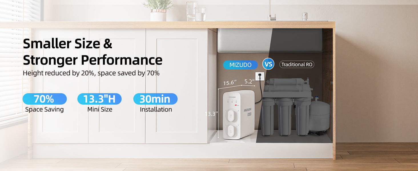 - 【Mini Size, Mighty Power】No undersink space is too limited for our ultra-compact RO system! It's 70% smaller than traditional RO and 30% smaller than other tankless systems, saving 75% of the space and fitting seamlessly into 99% of kitchens. Whether in apartments, small homes, offices, restaurants, cafes, hotels, or RVs, you can enjoy purified water without compromising on space or budget.