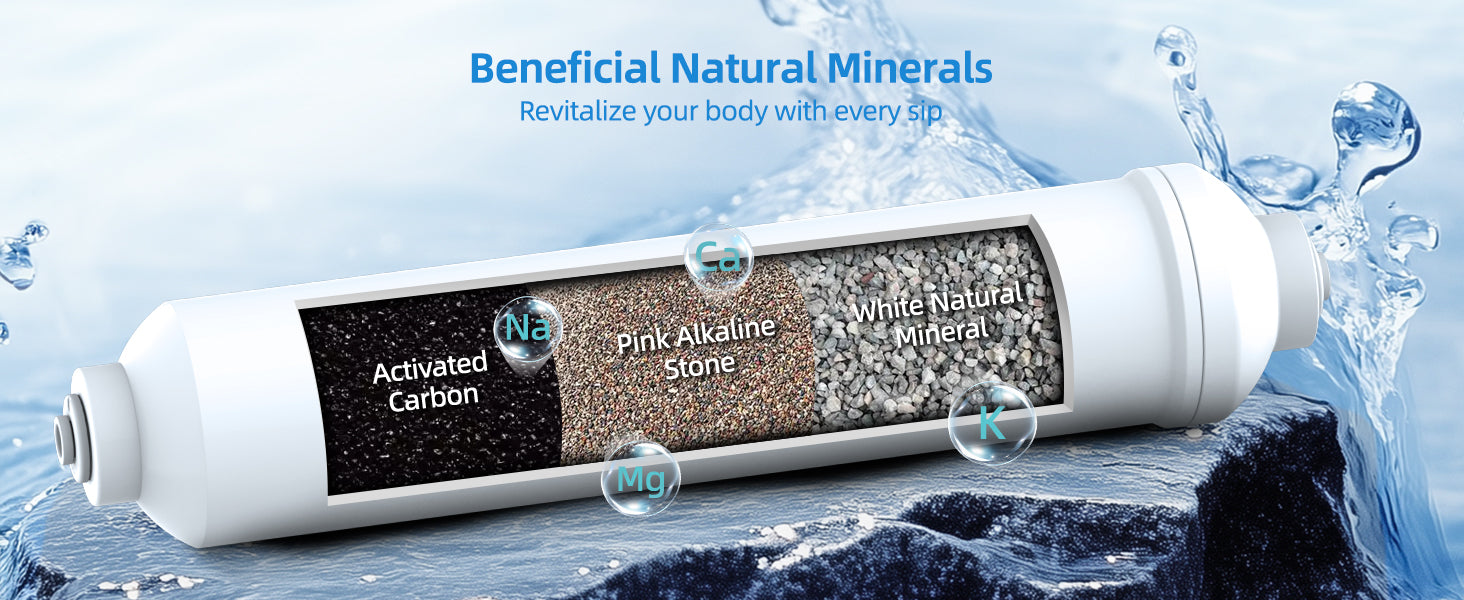 - Natural Materials: We extract raw minerals from nature that are rich in calcium, magnesium and sodium, which effectively raise the pH level of water for healthier drinking. Using these natural materials for alkaline water filtration not only makes the water refreshing and delicious, it also ensures safe drinking and improves the overall quality of life.