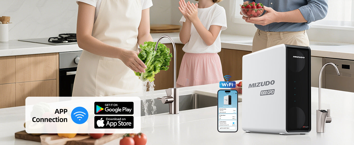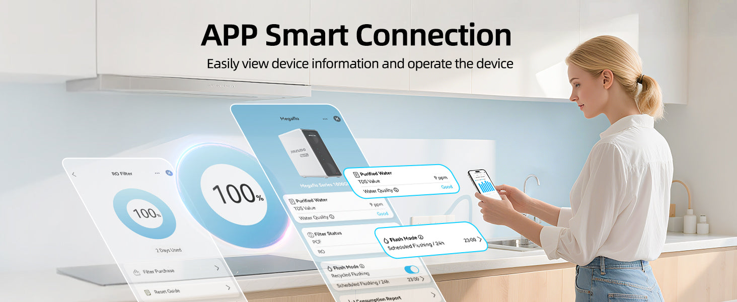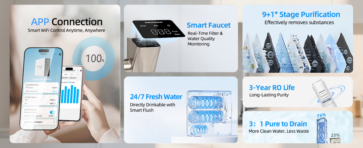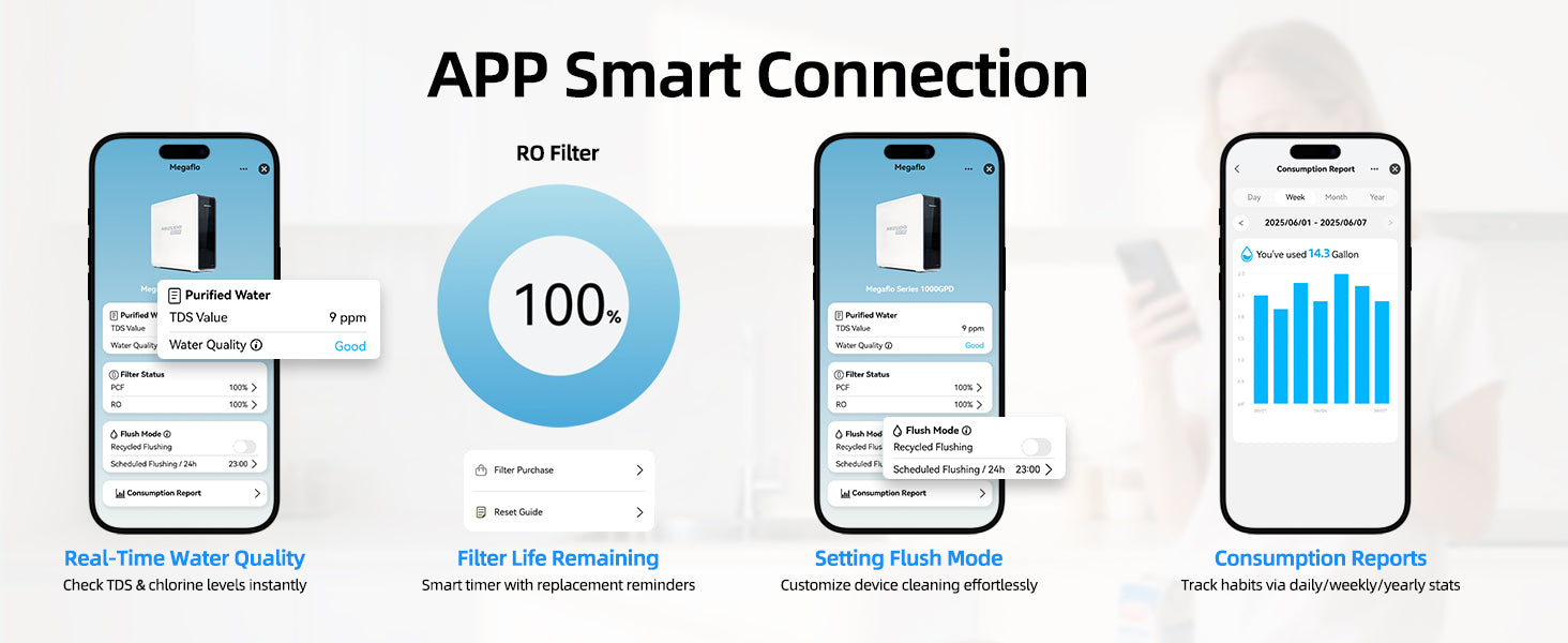 Megaflo Smart 1000GPD- 【First-to-Market RO System with Wi-Fi Functionality】 Monitor TDS levels and filter status anytime, anywhere. Schedule auto-flush with just one tap, and get instant replacement reminders—experience smart water filtration like never before.