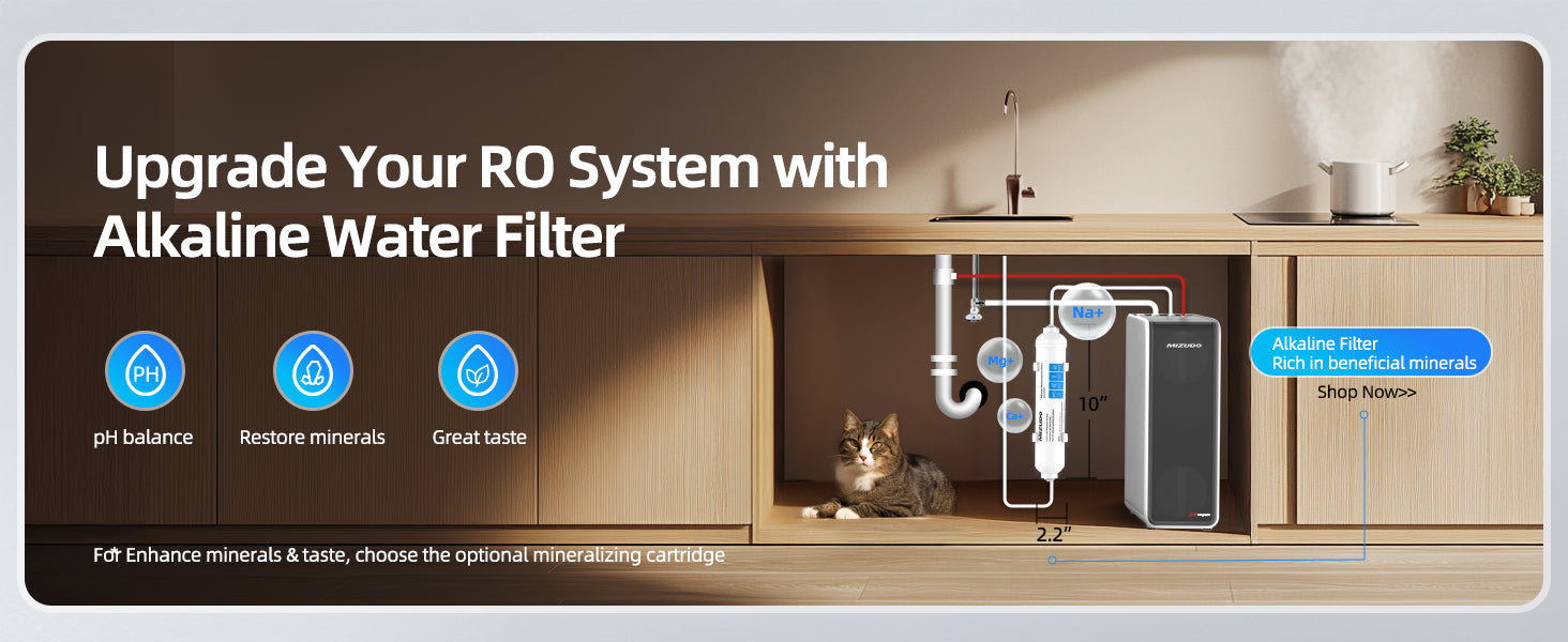- 【9 Stage Filtration with Optional Alkaline】Advanced 9-stage filtration with a 0.0001-micron RO membrane eliminates 99.99% of contaminants. Choose the alkaline mineral filter to infuse your water with 10+ minerals such as Ca, Mg, raising the pH to an optimal 7.5. It's more stable and longer-lasting than built-in mineral filter, providing healthier hydration, stronger bones, and enhanced flavors in your cooking and drinking.